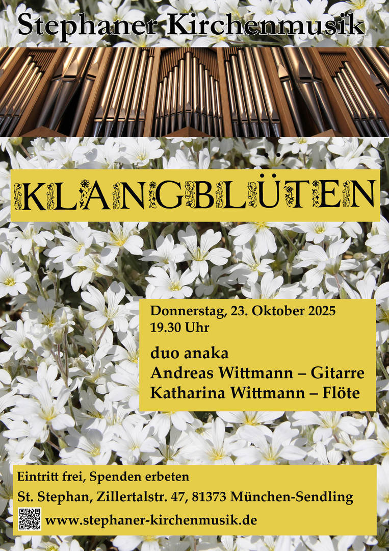 Katharina Wittmann (Flöte) und Andreas Wittmann (Gitarre) spielen Klangblüten – ein Geburtstags-konzert für den Verein. Es erklingen Werke von Ferdinando Carulli, Mauro Giuliani, Jaques Ibert und Scott Joplin.