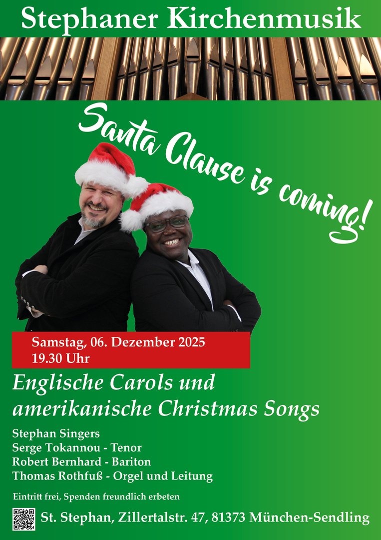 „Santa Clause is coming!“, heißt es am Samstag, dem 06.12.2025 um 19.30 Uhr in St. Stephan Sendling (Zillertalstr. 47). Unter diesem Titel bringen die Stephan Singers englische Carols und amerikanische Weihnachtssongs zu Gehör. Als Solisten sind Serge Tokannou (Tenor) und Robert Bernhard (Bariton) zu hören, die Leitung hat Thomas Rothfuß inne.