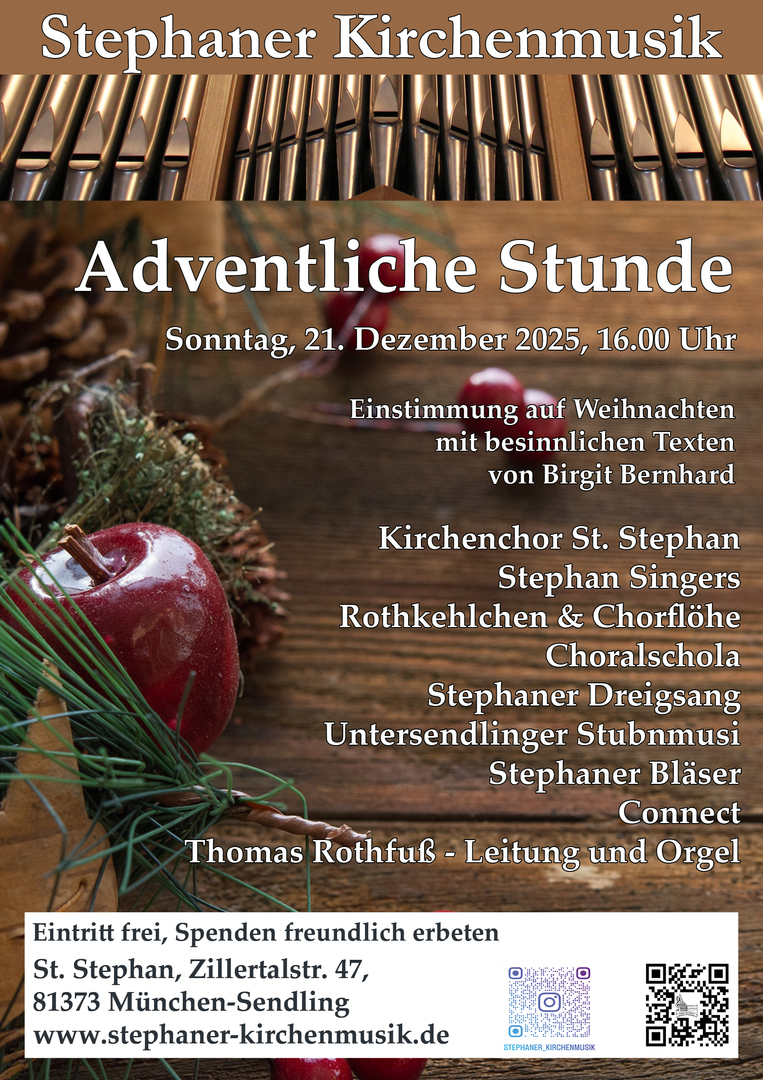Alle Chöre und Musikgruppen der Pfarrei stimmen auf Weihnachten ein. Unter der Leitung von Thomas Rothfuß musizieren um die 100 Musikbegeisterte in folgenden Gruppen: Chorflöhe, Rothkehlchen, Young Voices, Kirchenchor, Stephan Singers, Stephaner Dreigesang, Choralschola, Stephani-Bläser, die Band „Connect“ sowie die Untersendlinger Stubnmusi.